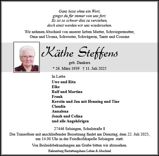geboren am 26. März 1939 in Selsingen gestorben am 11. Juli 2025 in Bremervörde