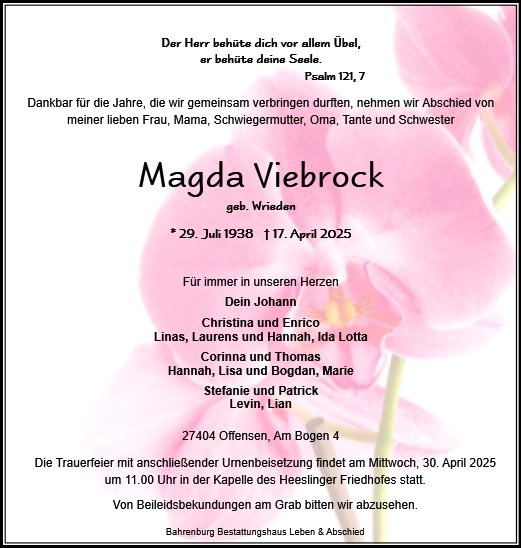 auf diesem Wege möchte ich ihnen, und besonders Johann meine aufrichtige Anteilnahme aussprechen. Gerne erinnere ich mich an Telefonate oder persönliche Gespräche mit Magda.